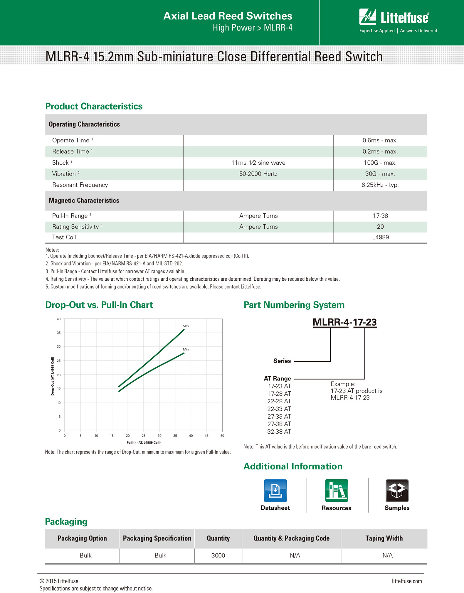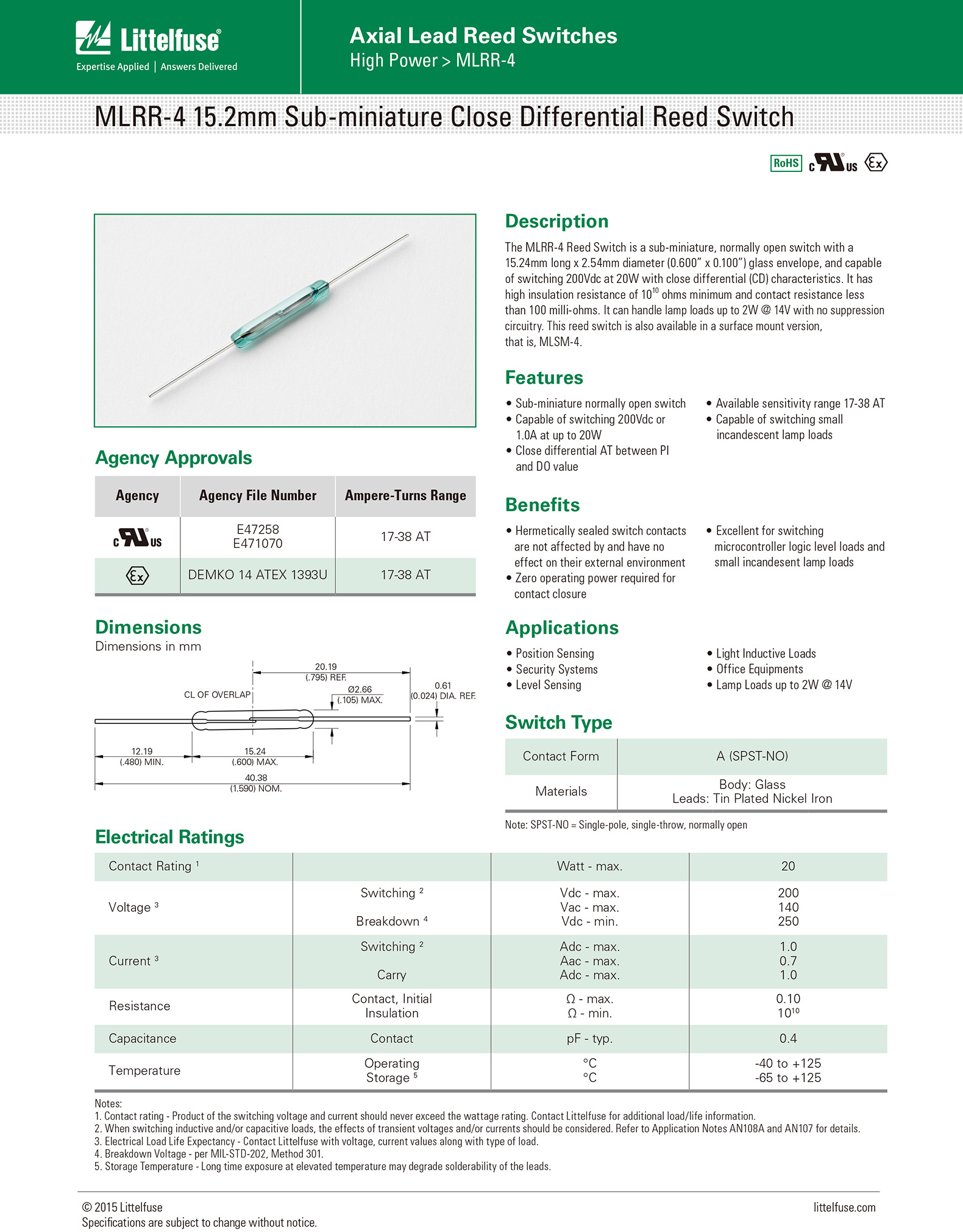Function and Features: Low switching hysteresis (near difference) normally open switch with maximum switching voltage and power of 200Vdc and 1Adc respectively (maximum power of 20w) The available sensitivity range is 17-38 AT. The minimum high insulation resistance is 10 ¹⁰ ohms, and the contact resistance is below 100 milliohms. It can handle lamp loads up to 2W @ 14V without the need for suppression circuits