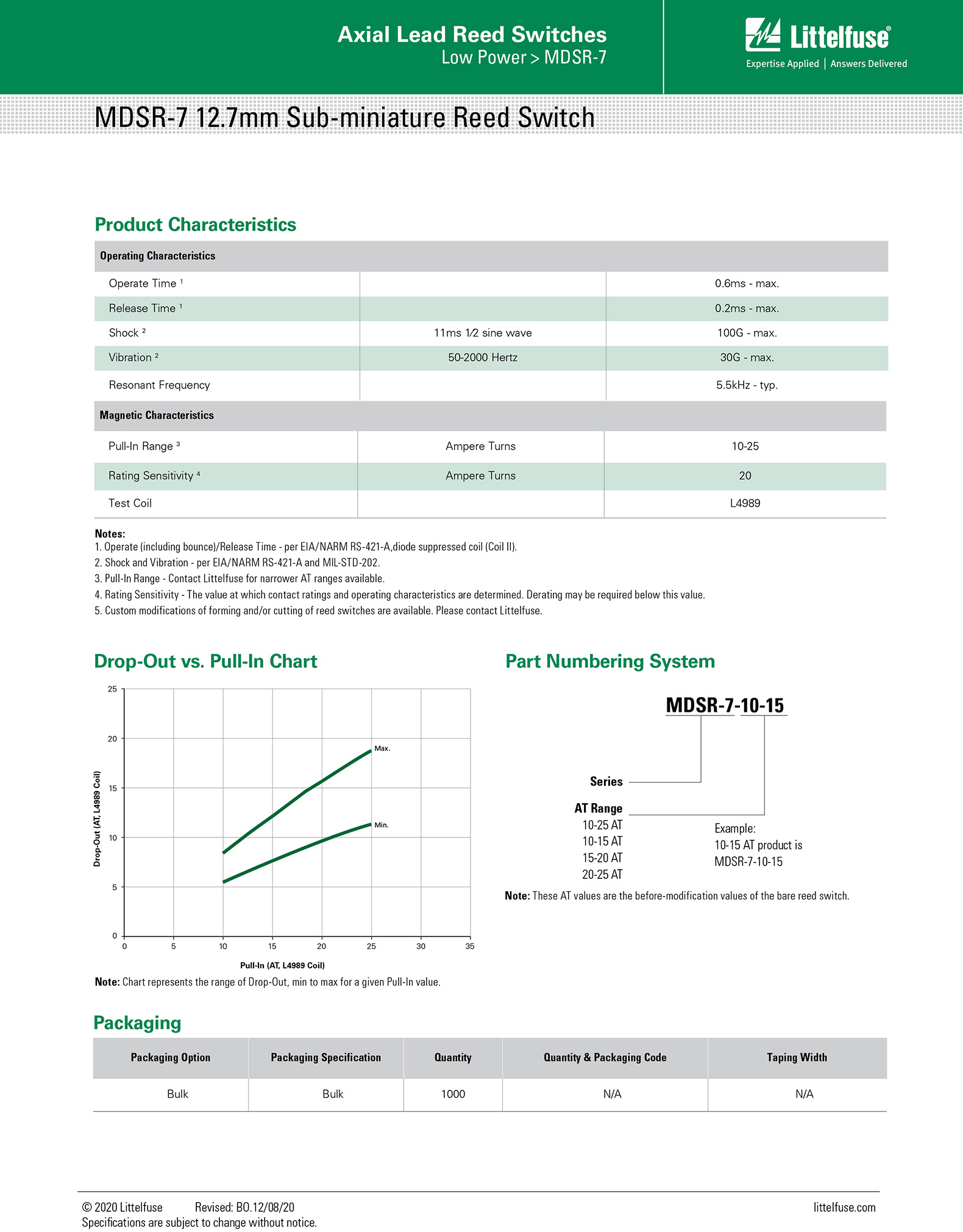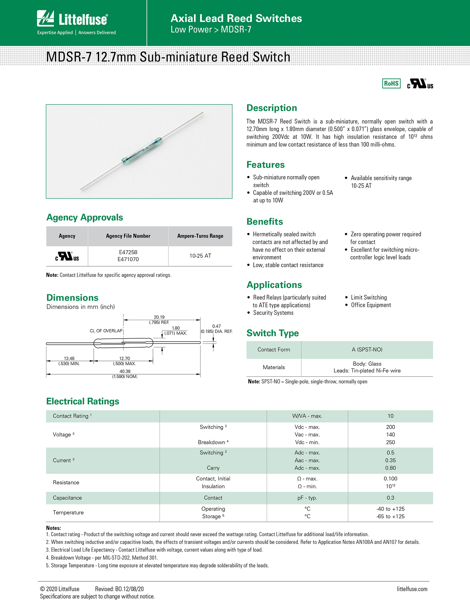 Function and Features: The maximum switching voltage and power are 200Vdc and 0.5A respectively (maximum power 10W) The available sensitivity range is 10-25 AT. The minimum high insulation resistance is 10 ¹² ohms, and the low contact resistance is below 120 milliohms