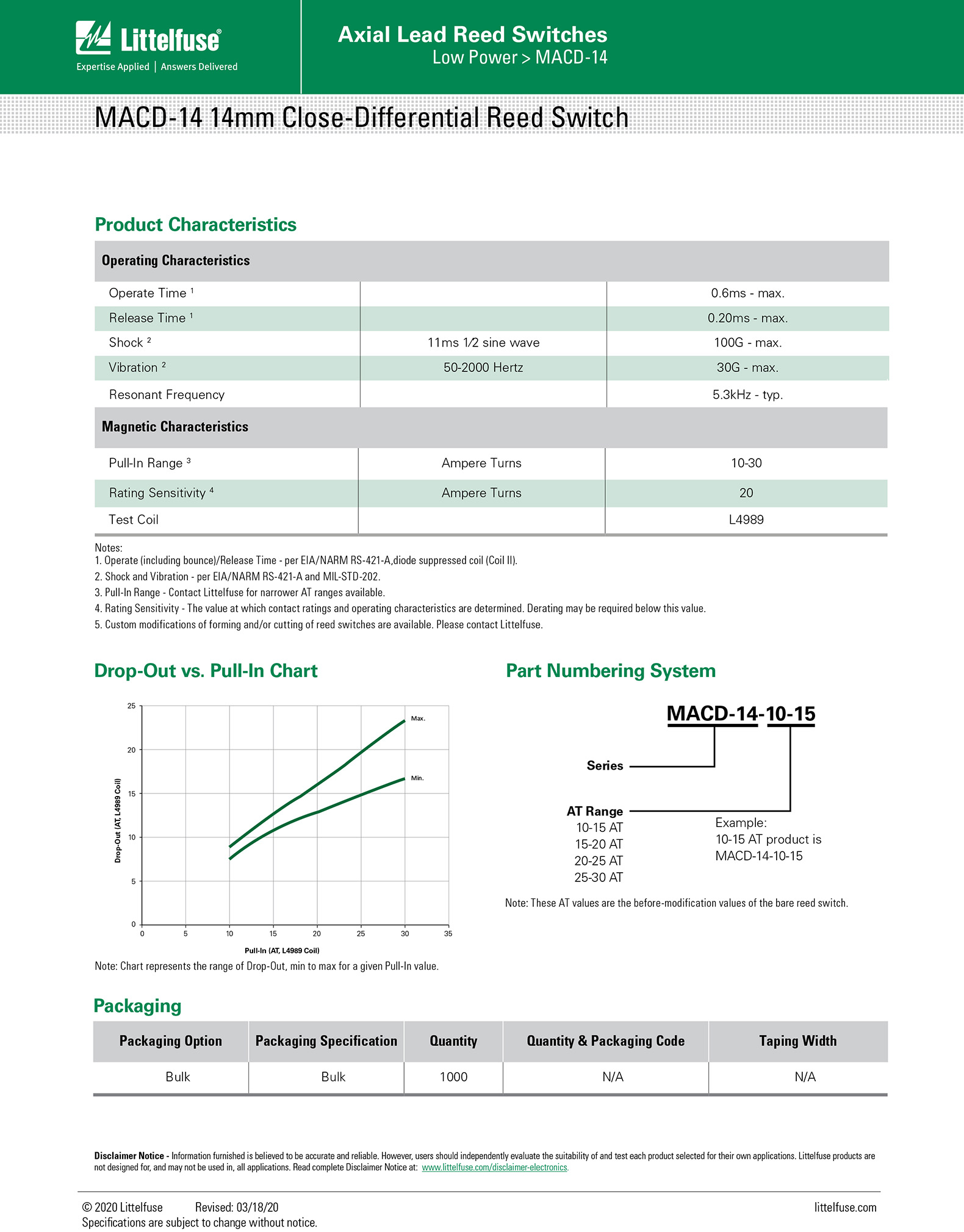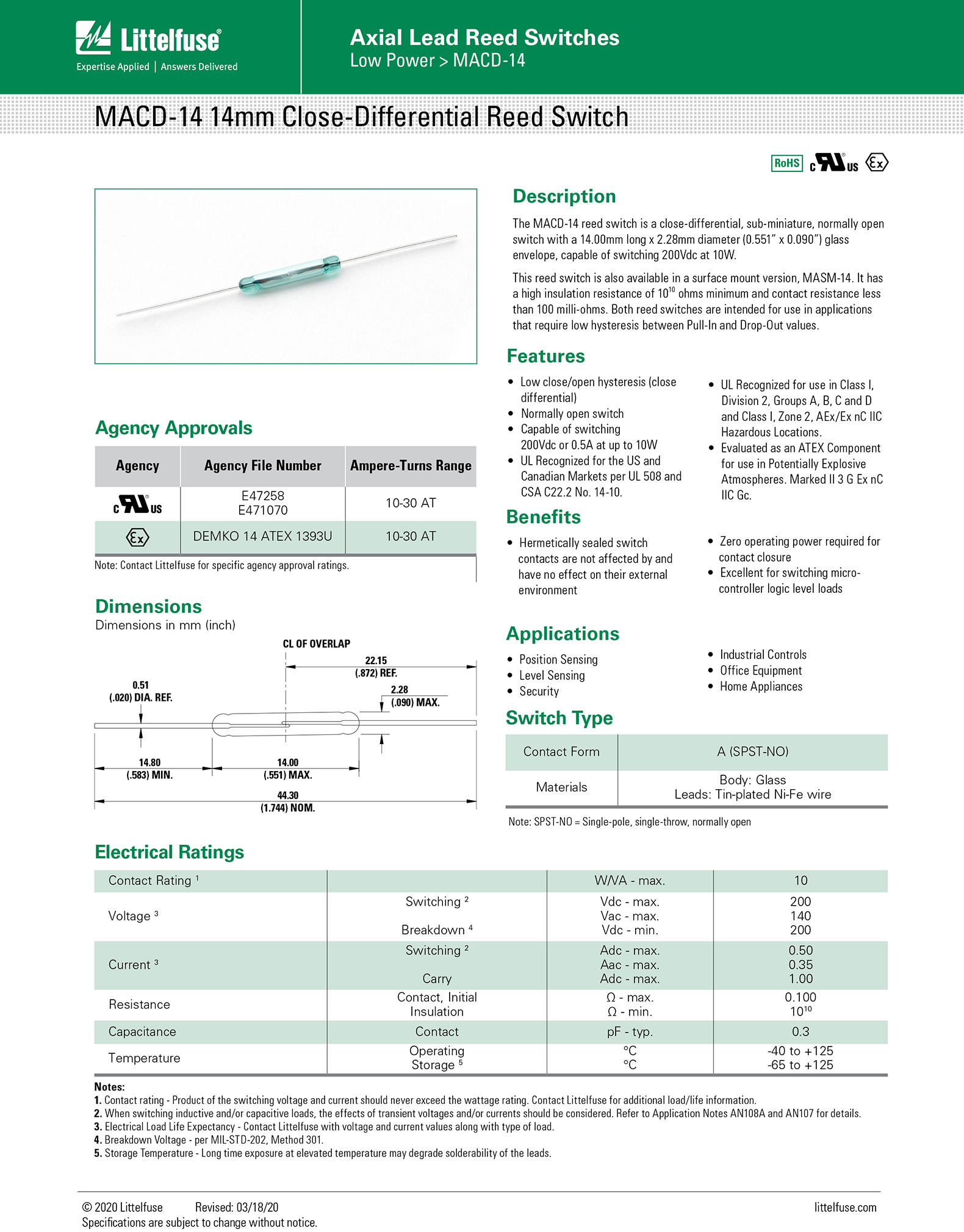 Function and Features: Ultra small, closed differential, normally open switch; The maximum switching voltage and power are 200Vdc and 0.5A respectively (maximum power 10W) The available sensitivity range is 10-30 AT. The minimum high insulation resistance is 10 ¹⁰ ohms, and the low contact resistance is below 100 milliohms