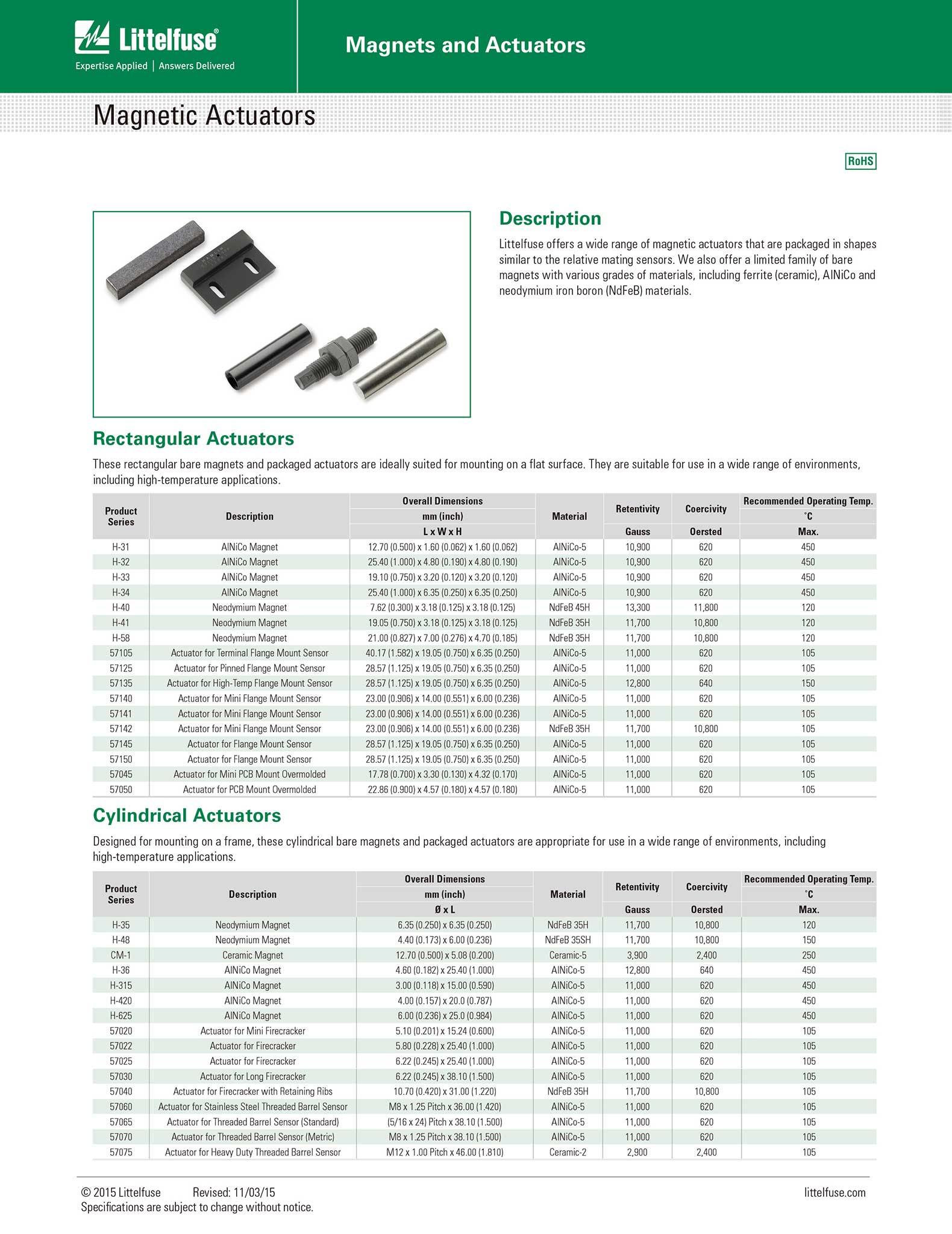 采用矩形法兰/扁平封装的AINiCo-5磁体,外形尺寸为28.57mm长x19.05mm宽x6.35mm高,建议与59135法兰/扁平封装磁簧传感器配合使用。
