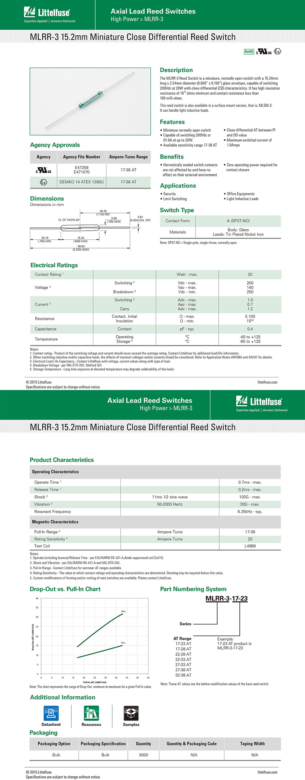 功能与特色:低开关滞后(近差)最大切换电压和功率分别为200Vdc和1Adc(最大功率为20w),可供选择的灵敏度范围为17-38AT, 最低10¹⁰欧姆的高绝缘电阻,低于100毫欧姆的接触电阻,能处理最高2W和14V的电灯负载且无需抑制电路。