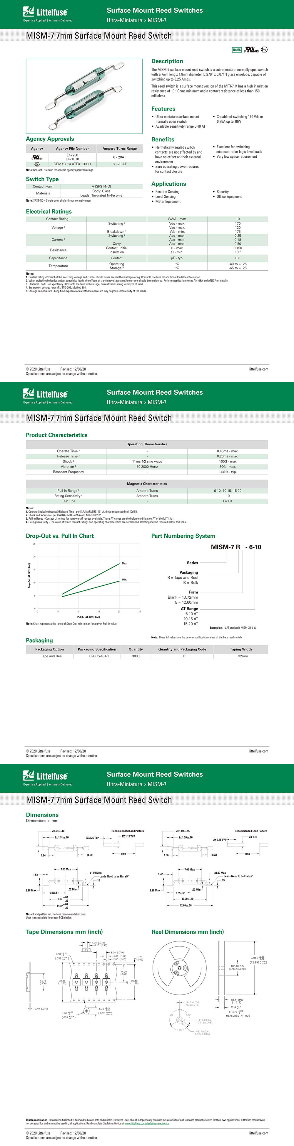 功能与特色:超小型表面安装式常开开关,最大切换电压与电流分别是170Vdc和0.25A(功率最高10W),可供选择的灵敏度范围为6-10AT,具有至少10¹²欧姆的高绝缘电阻以及低于100毫欧姆的接触电阻。