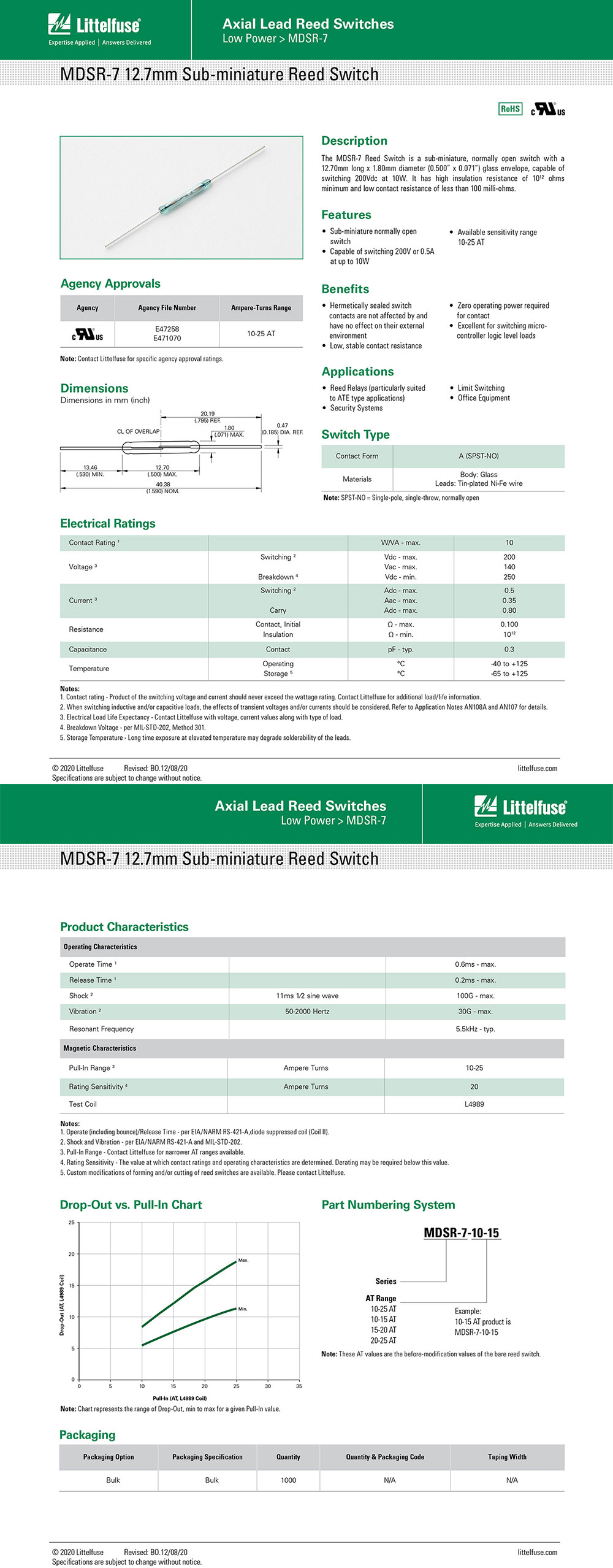 尺寸:玻璃管尺寸(max)12.70mm长x1.80mm直径(0.500" x 0.071")