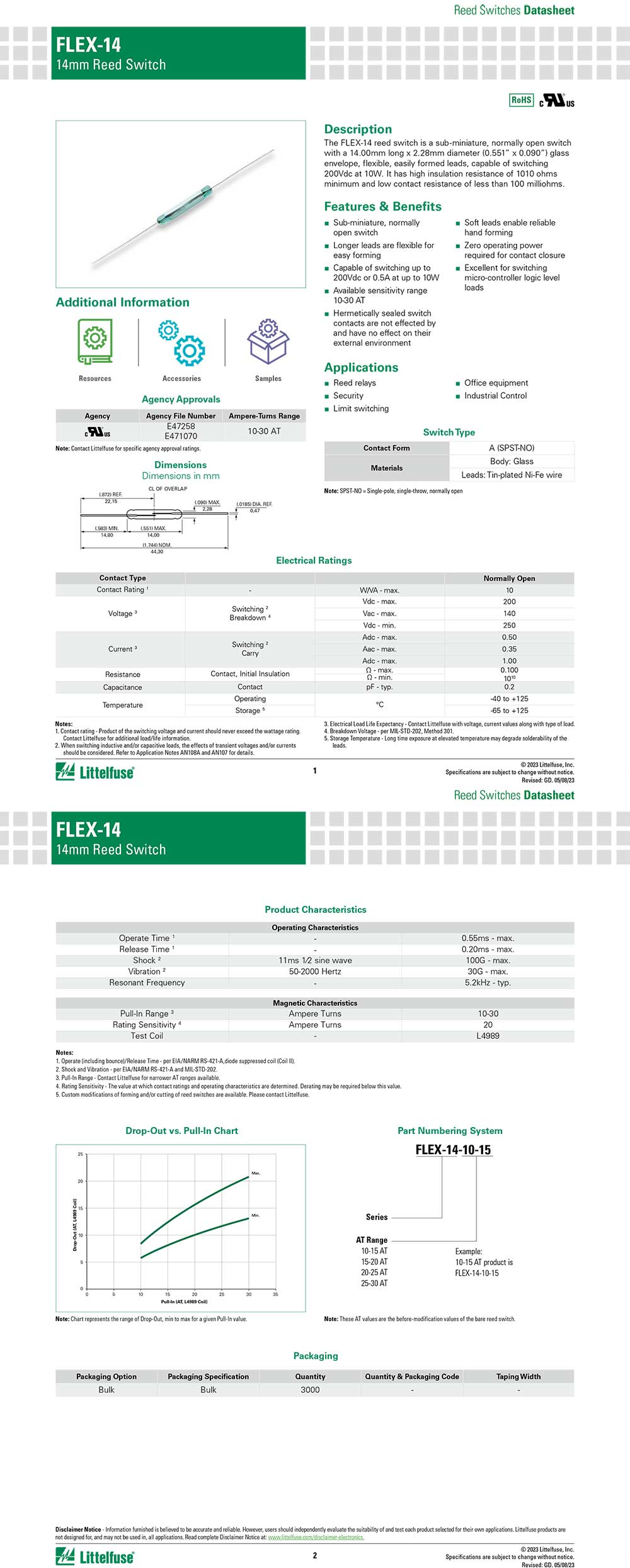 功能与特色:玻璃外壳的超小型常开开关,引线较长、灵活且易布置,最大切换电压和功率分别为200Vdc和0.5A。可供选择的灵敏度范围为10-30 AT,最低10¹⁰欧姆的高绝缘电阻,低于100毫欧姆的接触电阻。